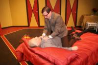 comic frenzy to the evening. He yells, overacts, loses his temper, resorts