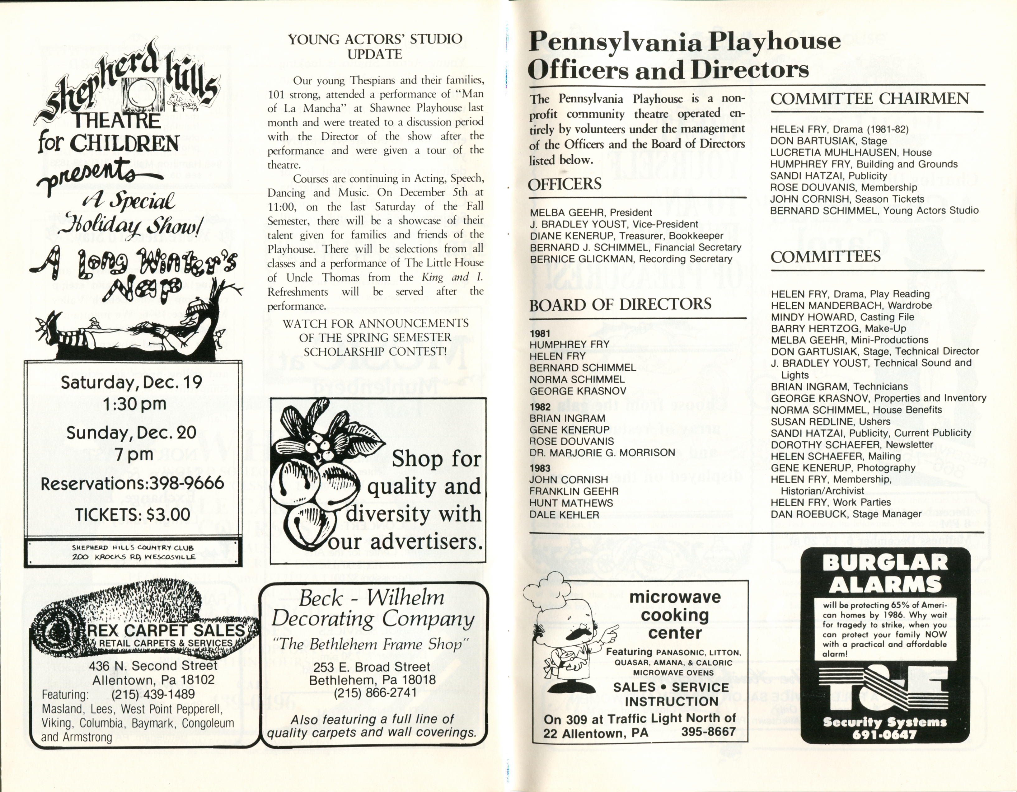 Set Construction | Donna Balluf, Alan Bolle, Anthony Bracali, John Bracali, Scott Brunell, Humphrey Fry, Elizabeth Gehringer, Barry Hertzog, Adrianne McCullion, Hunt Mathews, Jackie Yawney |